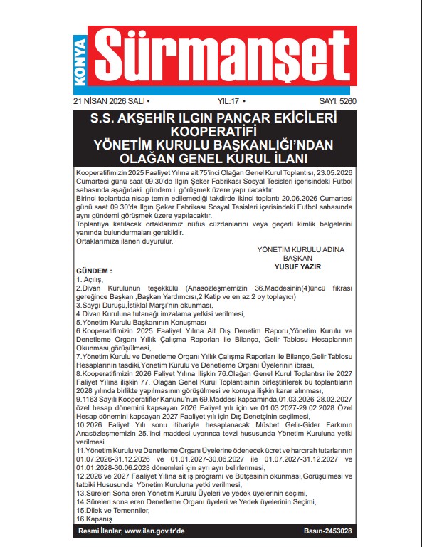 Kooperatifimizin 2025 Faaliyet Yılına ait 75’inci Olağan Genel Kurul Toplantısı, 23.05.2026 Cumartesi günü saat 09.30’da Ilgın Şeker Fabrikası Sosyal Tesisleri içerisindeki Futbol sahasında aşağıdaki gündem i görüşmek üzere yapı ılacaktır.